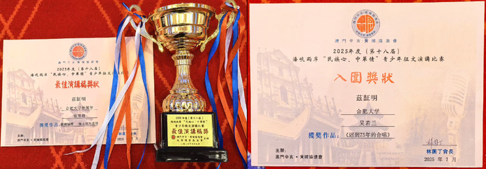 近日,由澳門辛亥?黃埔協(xié)進(jìn)會(huì)主辦的第十八屆海峽兩岸“民族心、中華情”青少年征文演講比賽在澳門舉行。我校語(yǔ)言文化與傳媒學(xué)院徐萌萌和吳若蘭代表安徽省大學(xué)生參加比賽,徐萌萌榮獲“最佳演講稿獎(jiǎng)”,吳若蘭榮獲“英才獎(jiǎng)”。