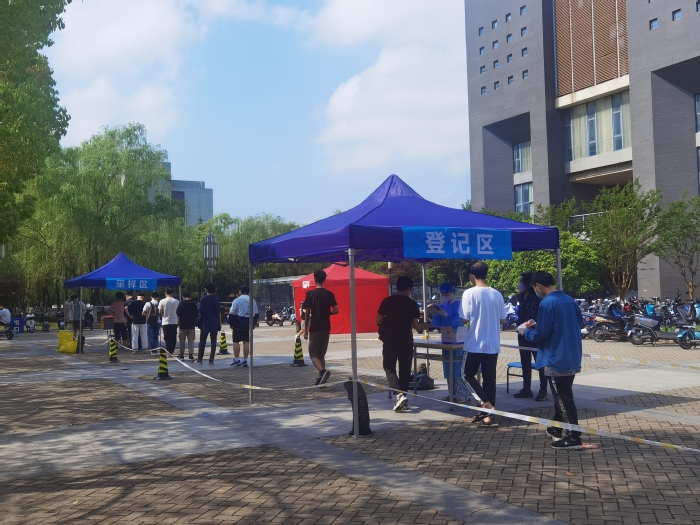 上午八點半,全員核酸檢測正式開始。檢測現(xiàn)場嚴格落實疫情防控要求,參檢師生佩戴口罩間隔1米排隊,查驗健康碼和行程碼、測溫、信息登記、咽拭子采樣、離場……全體人員積極配合,一切有條不紊。在現(xiàn)場,黨政辦、人事處、學(xué)生處、公管處、后勤集團、保衛(wèi)處等相關(guān)部門和各二級學(xué)院領(lǐng)導(dǎo)老師協(xié)助開展信息錄入、秩序維護等核酸檢測志愿服務(wù)工作,烈日炎炎,厚重的防護服下凝滿了細密的汗珠,但他們卻始終與醫(yī)護人員并肩堅守在“疫”線。