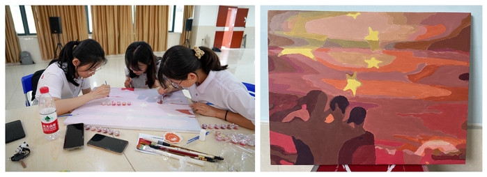 手繪我的祖國。習(xí)近平總書記在慶祝中國共產(chǎn)黨成立一百周年大會(huì)上對(duì)青年提出希望:“未來屬于青年,希望寄予青年”,臺(tái)下無數(shù)青年以“請(qǐng)黨放心,強(qiáng)國有我”與之回應(yīng),其聲久久回蕩在天安門廣場之上,讓人熱血澎湃。五星紅旗冉冉飄起,志愿者們面向國旗,莊嚴(yán)肅穆,這就是當(dāng)代青年心中祖國最美的樣子。實(shí)踐團(tuán)隊(duì)的成員們紛紛將紅色顏料沁入筆尖,一筆一畫中包含著對(duì)祖國的美好祝愿。