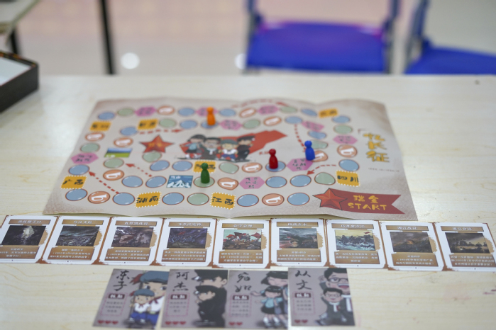 重走長征路。團(tuán)隊(duì)成員進(jìn)行了紅色飛行棋游戲。從瑞金出發(fā),按照紅軍長征的時(shí)間順序進(jìn)行設(shè)計(jì),每次安排四名游戲參與者,到達(dá)點(diǎn)位后需要完成不同的任務(wù)。每條路線的任務(wù)環(huán)環(huán)相扣,解密、闖關(guān),在親身參與和沉浸體驗(yàn)中學(xué)黨史、強(qiáng)信念,傳承和弘揚(yáng)紅色精神。