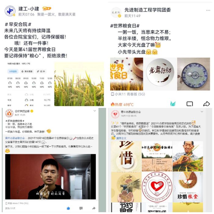 校青年志愿者聯(lián)合會通過網(wǎng)絡(luò)新媒體平臺推送了“糧食周”宣傳推文,通過向同學(xué)們宣傳節(jié)約珍惜糧食的古詩句和“水稻之父”袁隆平的故事等,普及愛糧節(jié)糧知識;校院兩級青年志愿者服務(wù)隊(duì)在校內(nèi)開展了隨機(jī)采訪、“愛糧之星”知識比賽、“光盤行動(dòng)隨手拍”等系列活動(dòng),在校內(nèi)掀起了一股愛惜糧食和“光盤行動(dòng)”的熱潮。