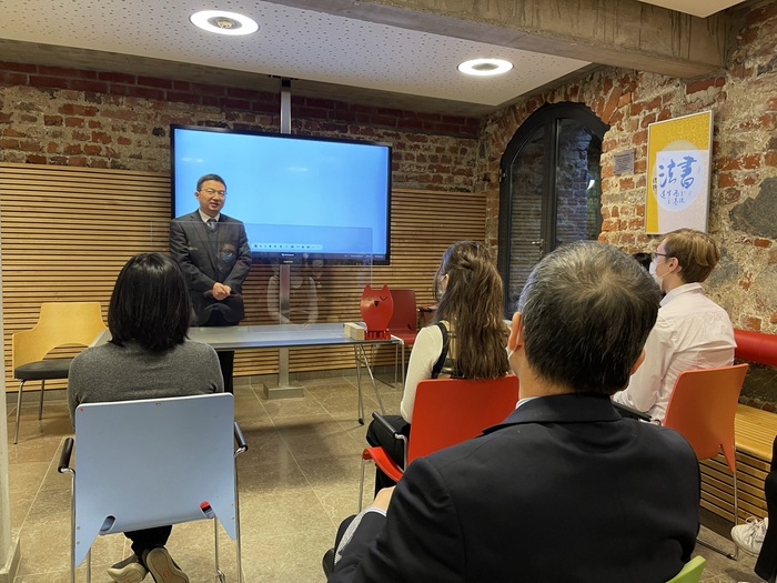 當日的頒獎典禮設在施特拉爾松德市立圖書館“百年書香”中國書畫展的展會會場。作為全球孔子學院日活動之一,該書畫展由施特拉爾松德孔子學院策劃組織,展出北京大學陳洪捷教授的書法作品、同濟大學李興無教授的山水畫作品共40余幅。頒獎典禮過后,黃偉公參為該書畫展致揭幕辭。黃偉表示,兩項活動相輔相成、相得益彰,望獲獎選手能夠通過中國書畫展進一步了解中國文化,激發出更加濃厚的學習興趣。