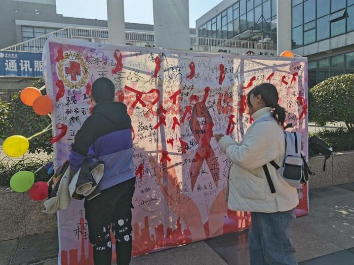 設(shè)宣傳展板,開展防艾簽名活動。在學(xué)校主要通道設(shè)置宣傳臺,開展展板簽名活動,分發(fā)預(yù)防艾滋病核心知識的宣傳折頁。預(yù)防艾滋,你我同行,簽下的不僅僅是名字,更是一份承諾。通過舉辦簽字活動激發(fā)了學(xué)生預(yù)防艾滋病的使命感和責(zé)任感。在學(xué)生宿舍區(qū)、食堂門口等人流量大的地方,共計懸掛橫幅4條、張貼宣傳海報30余張、分發(fā)宣傳折頁1000余張。