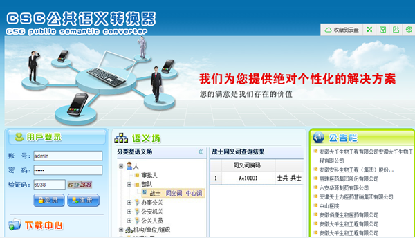 一個部署在公共網絡空間的跨領域的、獨立運行的軟件系統,將過去“一對一”的模式變成“多對多”的模式,無需事先人工協商數據項語義,也無需開發共享服務程序,一個可以直接進行數據交換的平臺——CSC公共語義轉換器。