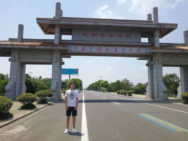 圖為調研人員在鳳陽縣小崗村牌樓前留影