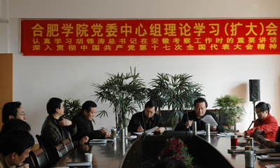大會由院黨委書記陶登松主持。首先,副院長、黨委委員鄭永紅、陳嘯、丁明就學習十七大及胡錦濤視察安徽時重要講話及省市有關會議精神,結合學院實際工作的心得體會與大家進行了交流。接著,鮑安義、劉建中、詹向紅、繆群道、崔國慶分別結合本部門的實際工作談了學習體會。