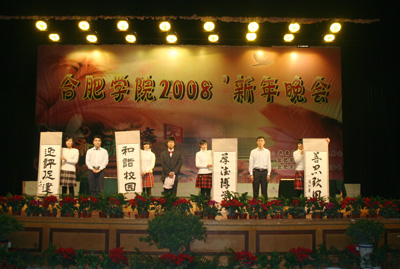 接下來是主題為“和諧校園”的2008新年晚會。新年晚會共分四個篇章,大學生藝術合唱隊演唱的《祝福祖國》和《瀏陽河》掀開了第一篇章“和,和校園之音”,另有異域風情的《蒙古風》帶給觀眾強烈的震撼。在第二篇章“諧,攜文化之韻”里,話劇《自習室》以詼諧幽默的方式揭示維護教室文明的重要性。《魔術與書法》這一節目巧妙地把魔術和書法兩種風格迥異的藝術形式結合起來,博得現場觀眾的陣陣掌聲。第三篇章“校,效奮進之風”,教育系陳琳老師的獨唱《我愛你,中國》表達了對祖國的深深愛戀。第四篇章“園,圓新春夢想”,外語系四名學生分別用英韓德日四國語言為我們獻上了新春祝福。最后晚會在全體演出人員的合唱《明天會更好》中圓滿結束。