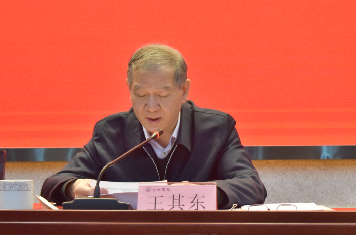 王其東代表學校黨委、行政領導班子作2022年度總結報告。他指出,2022 年,在省委省政府和市委市政府的堅強領導下,在省委教育工委、省教育廳的指導支持下,學校堅持以習近平新時代中國特色社會主義思想為指導,以迎接和學習宣傳貫徹黨的二十大精神為主線,堅持和加強黨的全面領導,統籌安全穩定和事業發展,學校高質量發展開創新局面。全校上下將繼續把黨的二十大精神貫徹落實到辦學治校的各方面,勠力同心克艱險,團結奮斗謀新篇,為加快建設高水平應用型大學、服務現代化美好安徽作出新的更大貢獻。