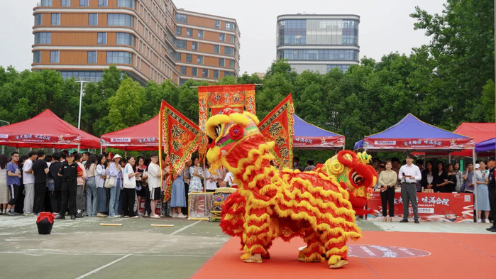 美食節不僅有美食,活動也不能少。在“校園文化與安徽美食”互動有獎問答環節中,在場觀眾積極參與,現場氣氛熱烈。在文藝演出環節中,伴隨著一聲聲鏗鏘有力的鑼鼓聲,國潮舞獅秀拉開帷幕,獅子時而騰空飛躍,時而俯身前行,高難度動作引來觀眾的熱烈掌聲和歡呼聲。啦啦操隊員們踏著動感的鼓點,躍動著輕盈的腳步,身姿律動、動作優美,自信的笑容感染著在場的每一位觀眾。合唱團悠揚動聽的歌聲吸引同學們紛紛駐足欣賞,音樂和美食共舞,將活動推向了高潮。
