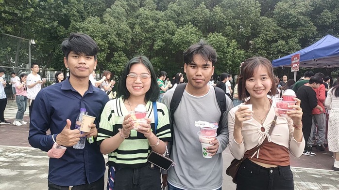 脆皮乳鴿皇,椒鹽排骨,香酥雞中翅,避風塘烤排,水煮牛柳,特色燒龍蝦……一排排整齊的美食車擺滿了色香味俱全的各類菜肴,校內各家餐飲公司紛紛拿出自家絕活,各色美食精彩呈現,廣場上食物飄香,讓人垂涎欲滴。師生們三五成群,在各個美食攤點前駐足流連,排隊品嘗豐盛美味的食物?,F場人頭攢動,每個人臉上都洋溢著快樂的笑容。