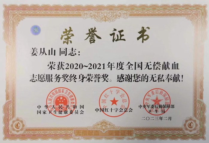 點滴熱血,“輸”寫大愛。日前,國家衛生健康委、中國紅十字會總會、中央軍委后勤保障部衛生局聯合發布《關于表彰2020—2021年度全國無償獻血表彰獎勵獲獎者的決定》,對2020—2021年度在無償獻血事業中作出顯著成績和貢獻的個人、集體、省(市)、部隊予以表彰獎勵,合肥學院馬克思主義學院教師姜從山獲無償獻血奉獻獎終身榮譽獎。