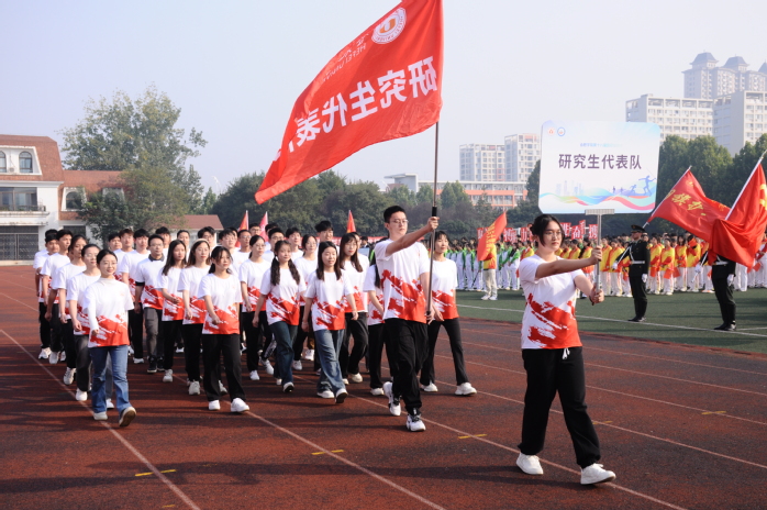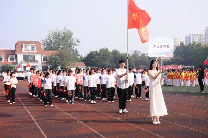 校國旗隊方陣托舉國旗率先入場,伴隨著雄渾壯闊的《運動員進行曲》,各二級學院、留學生、研究生代表隊緊隨其后,邁著鏗鏘有力的步伐依次走過主席臺前方。戴著紅色建筑安全帽的城市建設與交通學院方陣隊昂首闊步向前,能源材料與化工學院方陣攜化學元素周期表盡顯專業風采。“先進制造、制造先進,勇往直前、永不言敗”“信篤志堅、奮勇爭先,外院學子、拼搏向前”……響亮豪邁的口號聲此起彼伏。整齊的步伐、揮舞的旗幟,展現著全校運動健兒們團結向上、奮力拼搏的精神風貌。