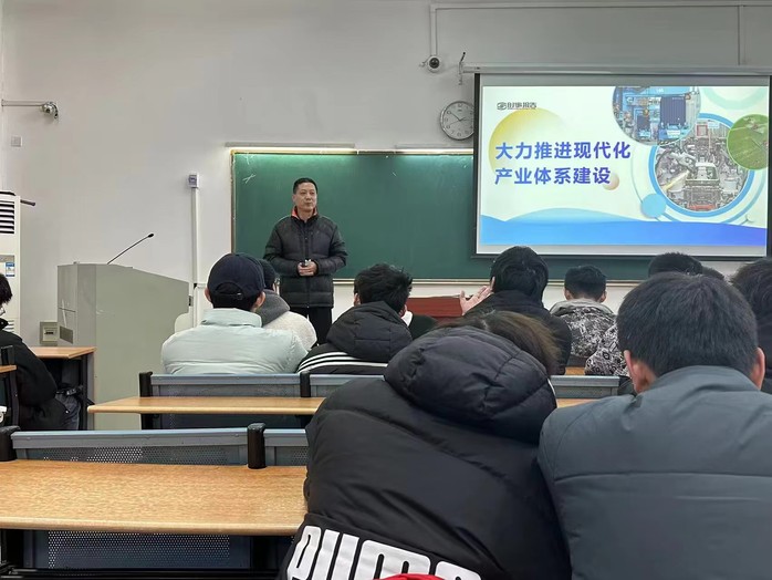 為充分發揮領導干部在思政課建設中的示范作用,提升思政課的教學效果,12月15日下午,黨委副書記劉建中以“大力推進現代化產業體系建設”為主題,給23級集成電路設計與集成系統和23級智能制造工程專業的本科生講授了一堂精彩的思政課。