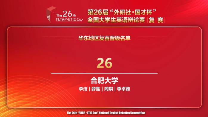 “外研社·國才杯”全國大學生英語辯論賽是2023年全國普通高校學科競賽排行榜內競賽項目,本次華東地區復賽中,來自山東、安徽、江蘇、上海、浙江省的116支隊伍參賽,安徽省內僅有2支參賽隊伍晉級全國決賽。我校外國語學院致力于培養新時代復合型應用型外語人才,重視并大力支持外語學科競賽等第二課堂活動。英語專業演講辯論競賽指導團隊多年來堅持指導學生參加各級各類英語辯論比賽,取得了豐碩的成果。