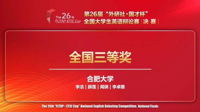 6月1日至2日,第26屆“外研社?國才杯”全國大學生英語辯論賽全國決賽舉辦,我校學子聞琪、李卓雅表現優異,獲全國決賽三等獎。