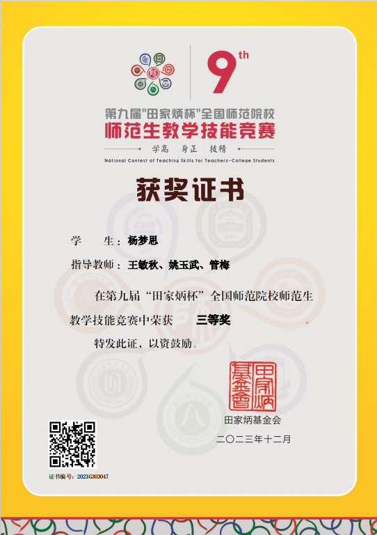 “自古圣賢之言學也,咸以躬行實踐為先,識見言論次之。”優異的成績不是終點,而是探索知識廣度與深度的起點,實踐環節更是檢驗知識的熔爐,各類學科競賽便是楊夢思探索的第一步。在數學競賽中鞏固專業知識,了解細分的研究方向,在建模競賽中鍛煉合作意識與解決問題的能力,學會尊重和包容他人的不同意見,在師范生技能競賽中提升授課水平,積累教學經驗。她獲得了第九屆“田家炳杯”全國師范院校師范生教學技能競賽三等獎,安徽省高等學校師范生教學技能競賽三等獎,全國大學生數學建模競賽安徽賽區本科組三等獎2023年安徽省大學生市場調查與分析大賽本科組二等獎,校級獎項數項。在合肥一中實習期間擔任實習老師,全方位配合指導老師,迅速上手各項工作,深入研究教材內容,依據自己的知識體系,針對教學目標的確定、重難點的把握積極出謀劃策,為指導老師提供有價值的參考意見,運用豐富的知識,結合生動有趣的案例,把復雜的知識簡單化,讓學生輕松理解。指導老師對其工作態度和教學能力十分贊賞,展現其良好的專業素養和潛力。