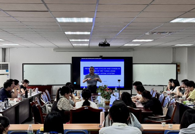 2025年6月24日上午,“分段光滑系統理論及其應用天元數學講習班”系列課程邀請華南理工大學二級教授、博士生導師楊啟貴教授37號樓305教室為天元班學員作短課程報告,報告主題為“非光滑系統同宿軌、奇異環與混沌復雜性”。本次報告由學院黨委書記牛欣教授主持。