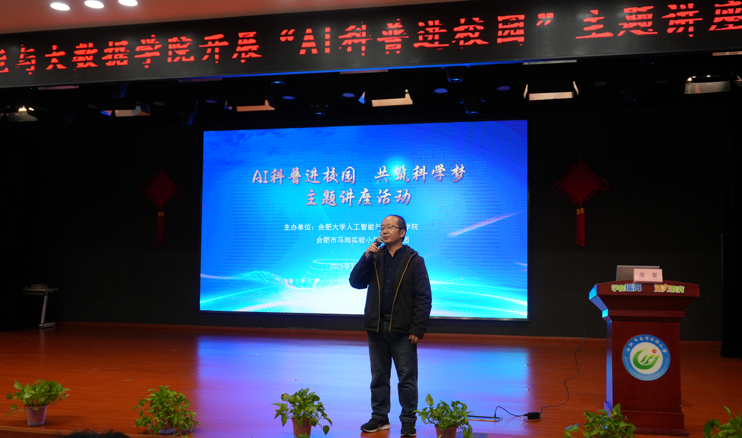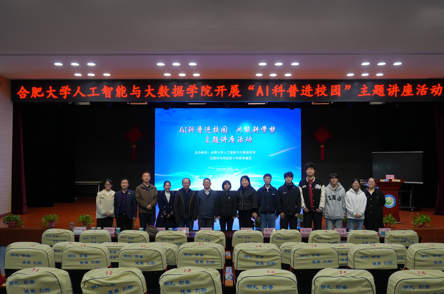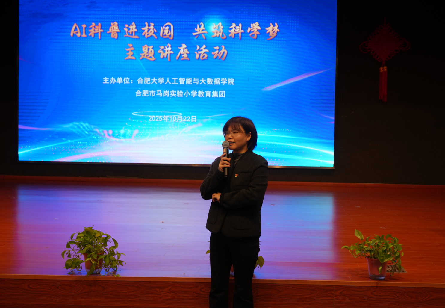 為積極響應國家人工智能教育普及號召,充分發揮高校服務社會的職能,人工智能與大數據學院教工第一黨支部于2025年10月22日下午,組織黨員教師赴合肥市馬崗實驗小學開展“強國行”專項行動之“AI科普進校園”主題講座活動。出席本次活動的領導與專家有人工智能與大數據學院黨委書記胡萍、教工第一黨支部書記何立新、副書記龍夏、組織委員陳艷平,以及合肥市馬崗實驗小學教育集團黨支部書記黃曉靜、校長薛文銀等。