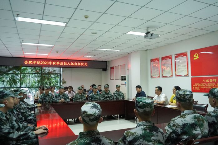 儀式上,張應杰宣讀了合肥學院2023年秋季應征入伍畢業生名單,匯報了我校2023年度征兵工作的完成情況。隨后擬應征入伍的2023屆經濟學專業畢業生孟現敏同學分享了自己參軍報國的初心與理想,表達了對軍營生活的向往,同時他感謝學校的國防教育,讓他更加堅定從軍理想。2023屆自動化專業畢業生牛磊同學表示,作為學生黨員,他將努力成長為一名有知識、有素養、有品德的新時代青年,用青春和汗水為祖國的繁榮富強和人民的幸福安康貢獻自己的力量。