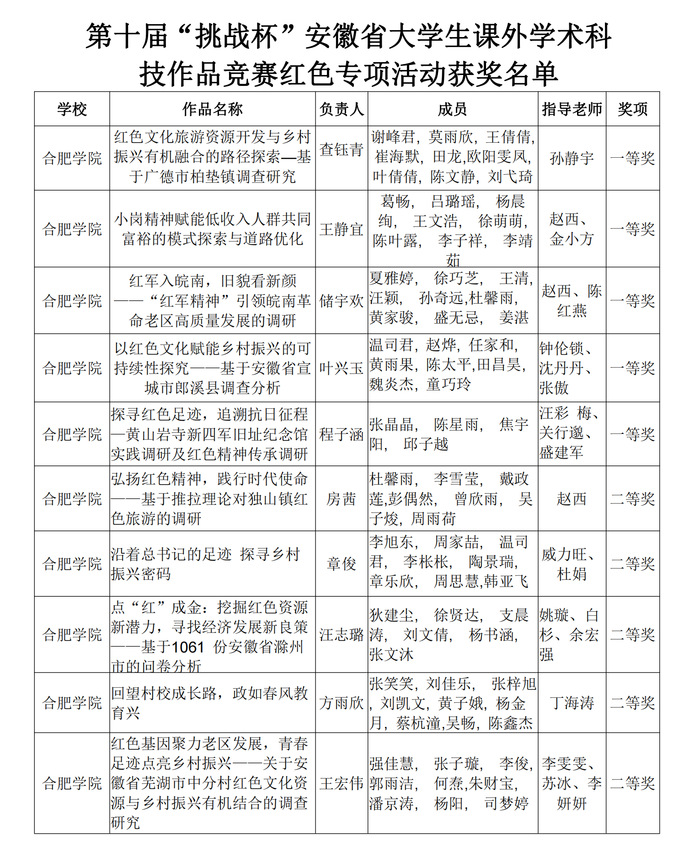近日,第十屆“挑戰杯”安徽省大學生課外學術科技作品競賽紅色專項活動結果揭曉。我校學生作品榮獲省賽一等獎5項、二等獎5項。
