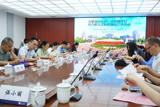 6 月 19 日上午,國際交流合作處處、財務處聯合合肥經開區稅務局在大學生活動中心一樓會議室舉辦“高校稅學行”暨稅收協定宣講活動。合肥市稅務局國際處、經開區稅務局相關負責人及稅務干部,國際交流合作處副處長孔春華、財務處副處長唐艷等部門負責人,外籍教師、留學生代表及對國際稅收政策感興趣的師生參與活動。