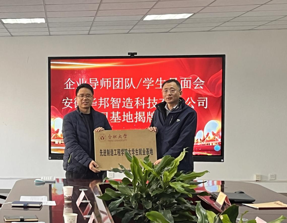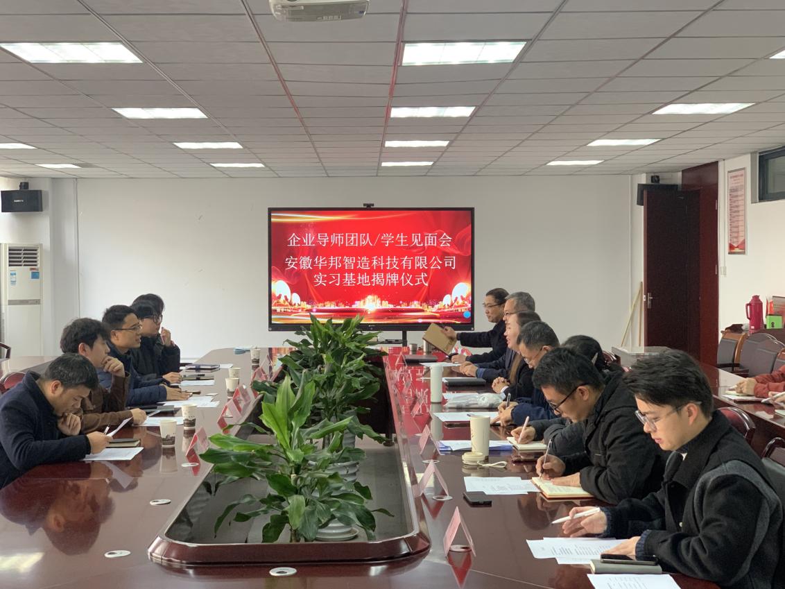 賈代發介紹了安徽華邦智造科技有限公司發展概況與會人員對企業的發展歷程、技術成果和企業文化有了深入了解。緊接著,舉行了就業實習基地授牌儀式這標志著雙方在人才培養和實習就業方面的合作邁出了堅實的一步該基地將為先進制造工程學院的學生提供更多的實習機會和實踐平臺,幫助學生更好地將理論知識與實際應用相結合,提高就業競爭力。授牌儀式后,企業導師、學生以及參會人員進行了合影留念