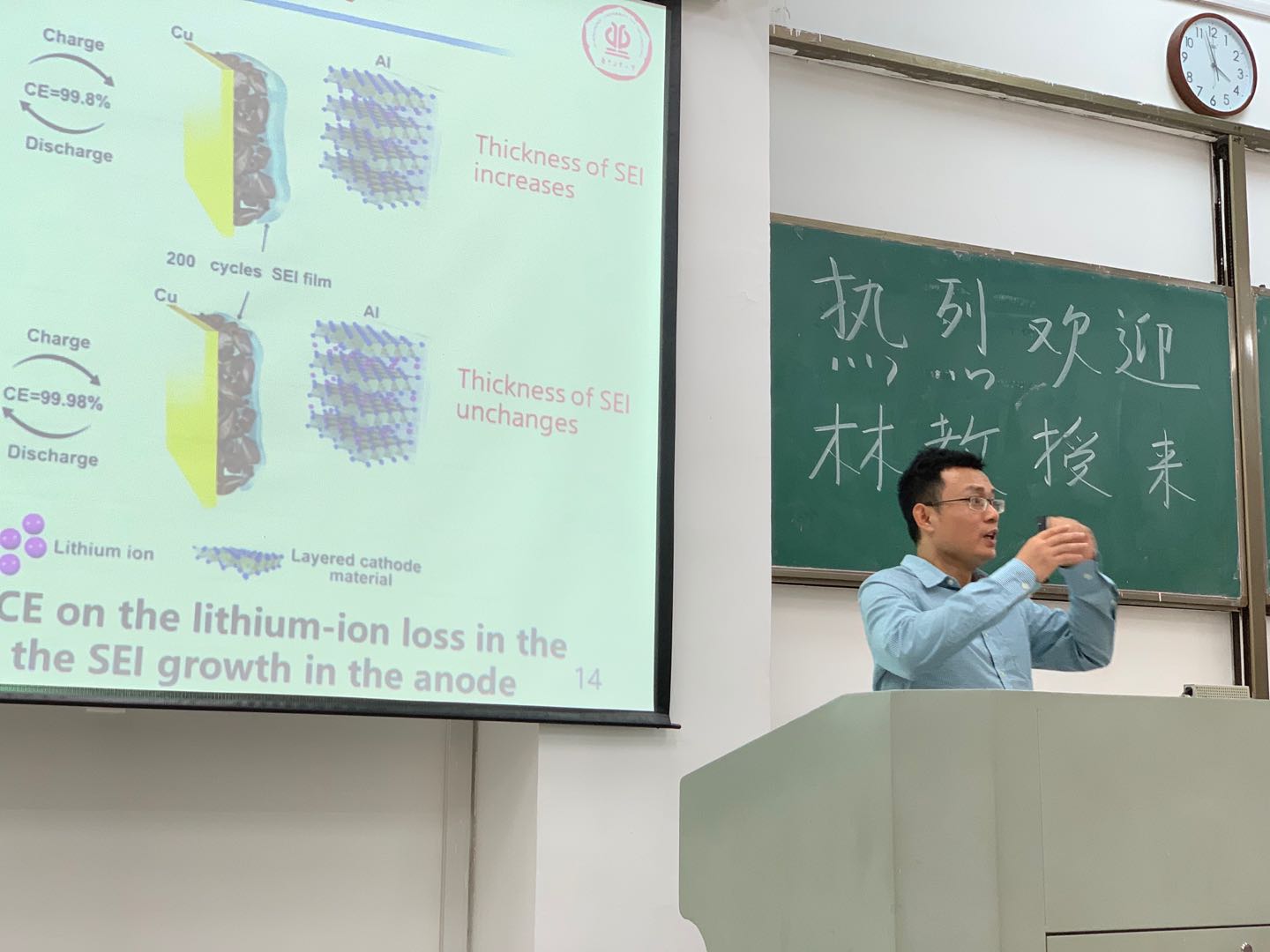林教授首先介紹了新能源汽車動力電池的市場需求和技術發展趨勢,指出動力電池高比能量(300-400Wh/kg)以及良好的安全性能一直是鋰離子電池追求的目標,也是電動汽車進一步普及的關鍵所在。負極體系中,硅作為鋰離子電池的理想負極材料,擁有10倍于石墨的理論容量(4200 vs. 372 mAh/g),可以有效滿足《中國制造2025》對動力電池高比能量密度的需求,但由于在循環過程中高達300-400%的體積變化,嚴重破壞了電池的電極結構,導致循環穩定性的下降。正極體系中,高比能層狀富鋰錳基正極材料具有非常高的理論比容量(>250 mAh/g),能夠有效滿足規劃中對動力電池高比能量密度的需求,但在循環過程中,電壓和容量衰減一直是富鋰錳基正極材料商業化面臨的最大挑戰,目前的研究認為這種衰減是由于高電壓下氧的釋放以及電解液的腐蝕引起的。報告圍繞高性能粘結劑對硅基負極循環性能的提高以及雙重修飾策略對富鋰錳基正極材料性能改進的重要作用等方面進行深入淺出的分析,開拓了我校相關研究人員的研究視野。