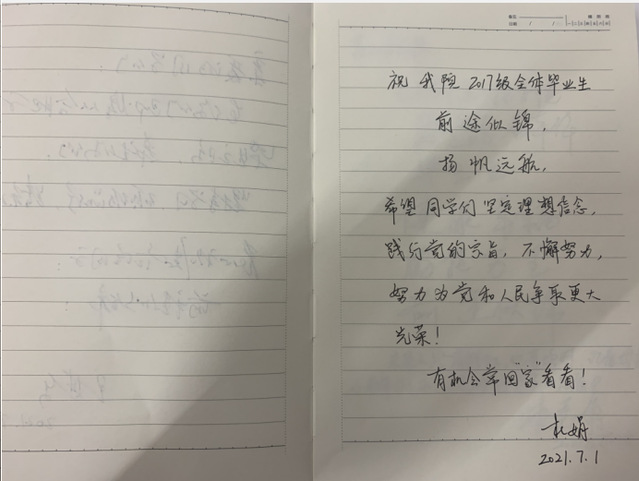 最后,王其東指出,希望先進制造工程學院黨委和智能制造學生黨支部能夠繼續做好黨史教育以及畢業生相關工作,提升支部建設水平,發揮好黨員模范帶頭作用,并為先進制造工程學院全體畢業生書寫畢業寄語,讓其堅持學習、踏實工作,砥礪前行。院黨委書記杜娟和黨委副書記李秀娟也同時為畢業生寄語,愿大家努力工作,堅守信念。