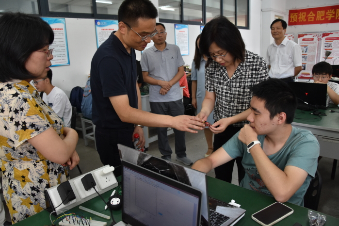 隨后,吳春梅來到創新實驗室,向正在緊張備賽的同學們表示問候,她詳細詢問同學們正在實驗的項目內容,了解大家在備賽中的困難和難點,叮囑同學們要努力備戰,勇于創新,把課堂理論所學應用于實踐創新,爭取以賽促學,提升個人專業水平和綜合素養。高先和介紹了從電子愛好者協會成長出來的優秀畢業生典型。吳春梅指出,電子愛好者協會提供了一個良好的平臺,學生們在創新技能競賽中能夠培養良好的創新意識,全方位鍛煉并提升實踐能力。吳春梅勉勵同學們認真準備,團結協作,發揮優勢,力爭突破,并與師生共同合影。