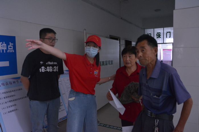 到達(dá)柿樹崗鄉(xiāng)之后,調(diào)研團(tuán)隊(duì)面對(duì)蚊蟲叮咬、天氣炎熱和較為艱苦的住宿環(huán)境沒有表現(xiàn)出畏難情緒,而是即刻參與到當(dāng)?shù)蒯t(yī)療衛(wèi)生工作之中。大家前往當(dāng)?shù)匦l(wèi)生院,協(xié)助醫(yī)護(hù)人員完成疫苗接種工作,幫助維護(hù)現(xiàn)場(chǎng)秩序,同時(shí)也為當(dāng)?shù)厝嗣衿占盎A(chǔ)醫(yī)療知識(shí),解答關(guān)于疫苗接種問題,消除未接種居民心中的疑惑與擔(dān)憂。