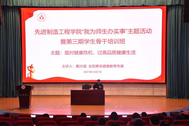 為結合黨史學習主題教育,深化“我為師生辦實事”主題活動開展,幫助師生養成良好健康生活習慣,樹立正確生活理念,12月7日下午,先進制造工程學院在圖書館報告廳舉辦“我為師生辦實事”主題活動,邀請全國著名健康教育專家戴光強教授來我校作健康知識專題講座,本次講座以“面對健康危機,過高品質健康生活”為主題,先進制造工程學院全體教職工和學院學生骨干培訓班全體學員聆聽講座。講座由先進制造工程學院黨委書記杜娟主持。