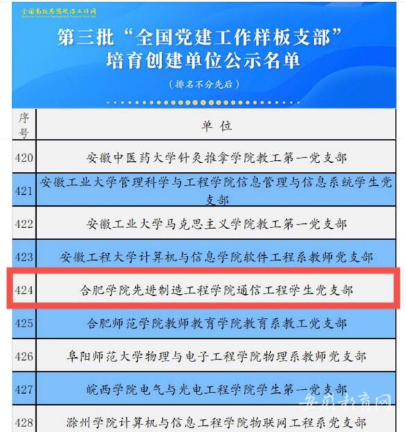 近日,教育部思想政治工作司公布關于第三批新時代高校黨建示范創建和質量創優工作評審結果,此次遴選共產生了11個全國黨建工作示范高校、100個全國黨建工作標桿院系、1000個全國黨建工作樣板支部培育創建單位。合肥學院先進制造工程學院通信工程學生黨支部成功入選第三批“全國黨建工作樣板支部”培育創建單位。