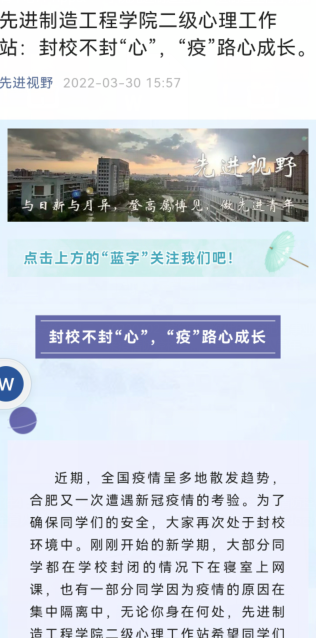 二是心理服務(wù)前移。在校學(xué)工部的指導(dǎo)下,針對當(dāng)前校園封閉管理對學(xué)生心理產(chǎn)生的影響,通過心理工作站“心靈驛站”功能發(fā)揮,加強學(xué)生心理干預(yù),提升服務(wù)水平,最大力度緩解學(xué)生壓力。明確心理咨詢途徑。在宿舍區(qū)設(shè)置了心理咨詢途徑宣傳欄,方便學(xué)生心理求助。明確心理咨詢隊伍。指定專職心理咨詢教師負責(zé)心理咨詢電話、QQ的接聽和疏導(dǎo),提高應(yīng)急心理疏導(dǎo)水平。
