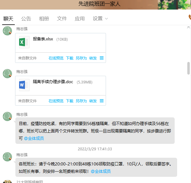封閉管理期間,學校制定了線上學習方案,大部分學生都在宿舍學習,我院學工隊伍勇挑重擔,在學校領導班子的帶領下,用學工人的溫度、力度和速度,筑牢校園抗“疫”堅強堡壘。學工隊伍通過QQ群、官方公眾號、騰訊會議、今日校園等渠道,拓展學生學習的時間和空間,每日都進行晨午晚檢打卡,這是疫情常態化下學校輔導員一直堅持的學生信息摸排工作。通過“拉網式”信息排查,輔導員可以精準摸排掌控包括實習學生在內的全校學生身體狀況和行動軌跡。另一方面,注重學生對傳染病防控、心理健康、安全法紀等知識的學習,強化對個別學生的教育和輔導。