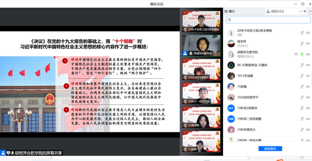 胡艷萍院長(zhǎng)在課程開(kāi)始圍繞中國(guó)共產(chǎn)黨十九屆中央委員會(huì)第六次全體會(huì)議通過(guò)的《中共中央關(guān)于黨的百年奮斗重大成就和歷史經(jīng)驗(yàn)的決議》展開(kāi)。胡院長(zhǎng)以安徽的發(fā)展為例,以“十個(gè)明確”的內(nèi)容為脈絡(luò),通過(guò)對(duì)安徽各地發(fā)展的實(shí)例,闡述了在黨的領(lǐng)導(dǎo)下、在新時(shí)代背景下,全國(guó)各地在經(jīng)濟(jì)建設(shè)、文化建設(shè)、社會(huì)建設(shè)、生態(tài)文明建設(shè)等多個(gè)方面取得的進(jìn)步。通過(guò)胡院長(zhǎng)的講述,我們不僅詳細(xì)的了解到建黨百年以來(lái),黨所面對(duì)的困難和黨領(lǐng)導(dǎo)人民創(chuàng)造的歷史性成就,而且更加深刻的理解了“十個(gè)明確”的思想理念和精神內(nèi)涵。