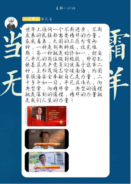 “榜樣是看得見的哲理。” 他們在平凡的崗位上奮斗出不平凡的成就,他們的先進事跡進一步激發了黨支部的工作斗志。檀革同志強調道:要像王書茂同志一樣,做到心中有信仰,腳下有力量。作為當代大學生的我們,要努力學習,積極向黨組織靠攏,服務同學,奉獻社會,奮力譜寫奮進新時代的精彩篇章。