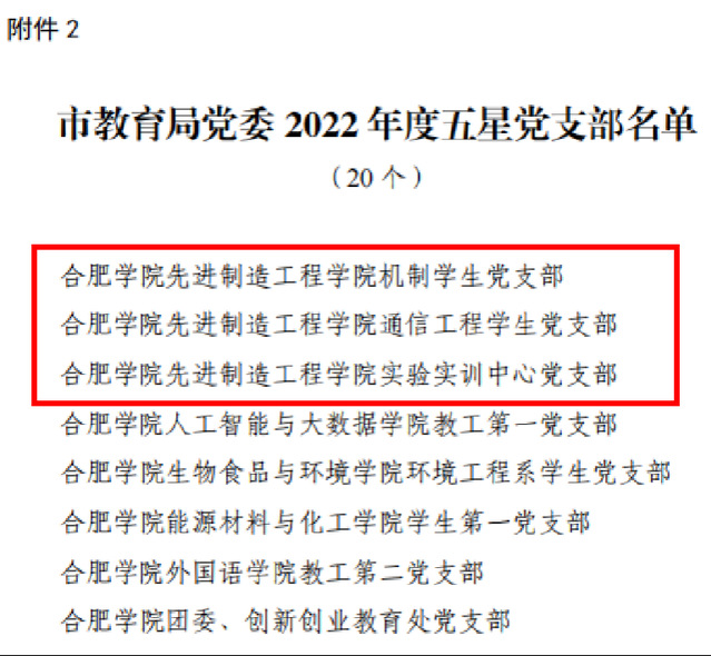 近日,中共合肥市教育局委員會下發了《關于公布2022年度四星、五星黨支部驗收審定結果的通知》(合教黨委〔2023〕12號),先進制造工程學院3個黨支部被評為五星級黨支部、3個黨支部被評定為四星級黨支部。