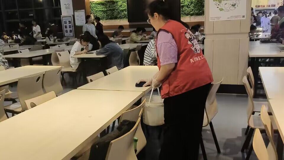 在學(xué)生用餐高峰期,食堂志愿者幫助食堂阿姨清理餐桌上的垃圾,并將桌椅板凳擺放整齊,同時(shí)在“收殘臺(tái)”處清理餐盤中的剩余食物并送至后廚清洗。在教學(xué)樓與寢室附近,志愿者將停放雜亂的車輛整齊擺放在規(guī)定的停車區(qū)域內(nèi),同時(shí)勸導(dǎo)正在停車的同學(xué)規(guī)范停車。