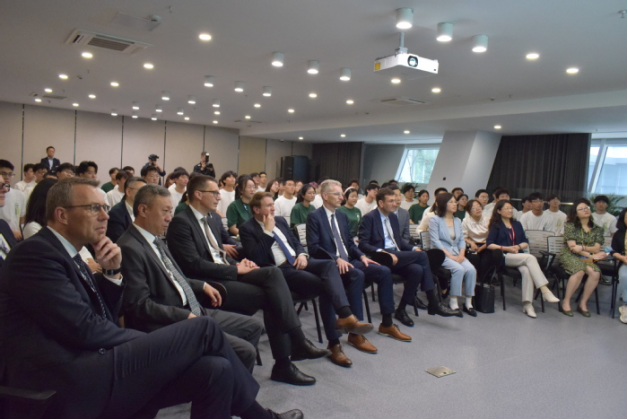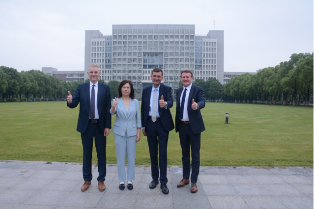 On the afternoon of May 26, HFU President Wu Chunmei extends a warm welcome to the delegation of Volkswagen Group led by Gunnar Kilian, member of its Management Board and Director of Human Resources Management.