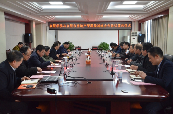 為發揮高校和行業管理部門各自優勢,提高市場監測分析水平,建立完善房地產宏觀調控機制,3月22日,合肥學院與合肥市房地產管理局簽訂戰略合作協議。合肥市房地產局黨組書記、局長許道和,副局長宣圣進,合肥學院黨委委員、紀委書記洪家友,副校長陳秀等參加簽約儀式。合肥學院教務處處長王曉峰、經濟系主任陳江華、合肥學院房地產研究所所長朱德開、合肥學院房地產研究所副所長凌斌等參會。