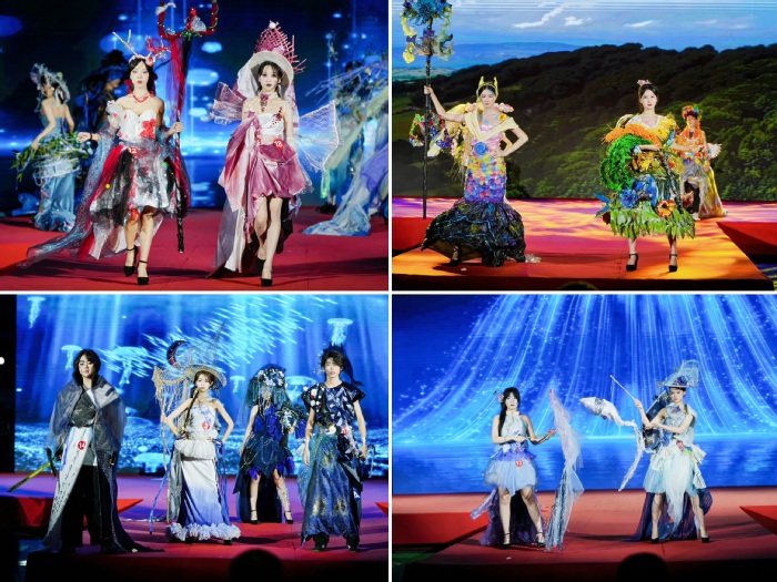 各二級學院的模特身著自行設計的服裝作品,在絢麗的舞臺上盡情展示風采,傳遞對自然之美的敬意和對可持續時尚的追求。現場評委對各團隊的表現進行綜合打分,評選出優秀模特獎、優秀服裝設計獎、最佳表演獎及優秀團隊獎。