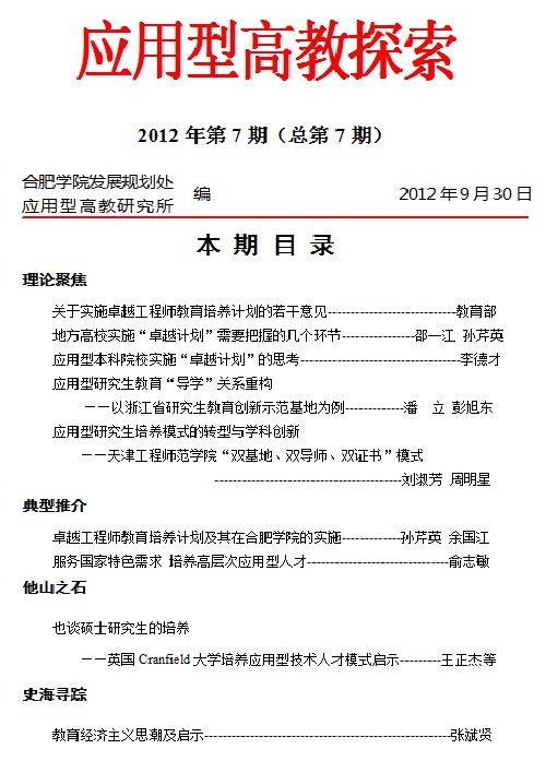 | 為貫徹教育部《關(guān)于實(shí)施卓越工程師教育培養(yǎng)計(jì)劃的若干意見(jiàn)》和國(guó)務(wù)院學(xué)位委員會(huì)《關(guān)于開(kāi)展“服務(wù)國(guó)家特殊需求人才培養(yǎng)項(xiàng)目”——學(xué)士學(xué)位授予單位開(kāi)展培養(yǎng)碩士專業(yè)學(xué)位研究生試點(diǎn)工作的通知》的文件精神,《應(yīng)用型高教探索》第7期以“卓越計(jì)劃”和“專業(yè)碩士教育”為主題組稿,目錄如下,具體內(nèi)容請(qǐng)廣大教職工查閱發(fā)展規(guī)劃處網(wǎng)站(http://www.evki8c9.xyz/fgc/),并將您的寶貴意見(jiàn)或建議反饋至我處。 第8期擬以 “教學(xué)方法改革”為主題組稿,歡迎大家積極投稿或推薦相關(guān)文章。 聯(lián) 系 人:陶龍澤 聯(lián)系電話:2159213 郵 箱:fzghc@hfuu.edu.cn. 發(fā)展規(guī)劃處 二○一二年九月三十日  | |