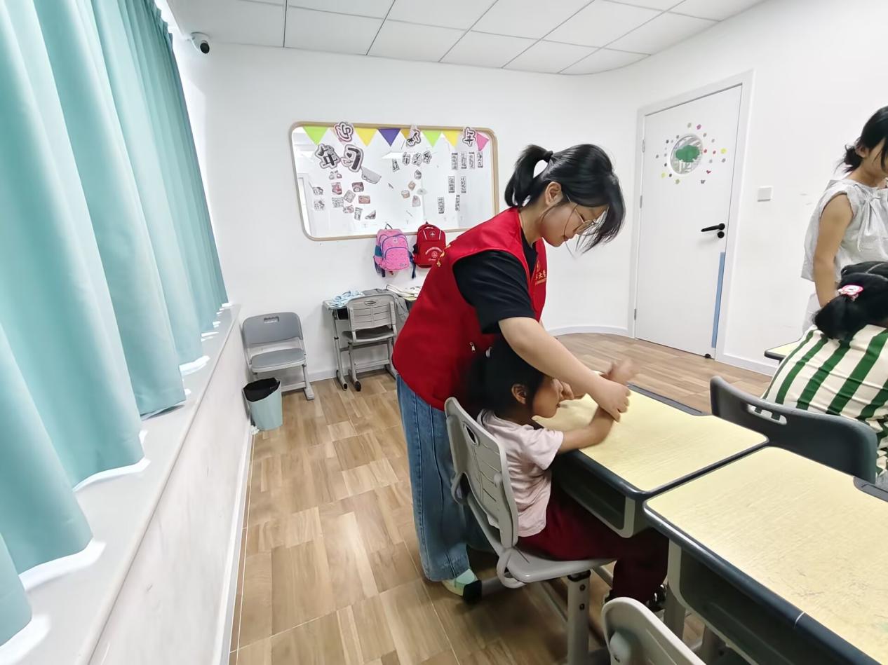 在園長的精心安排下,志愿者們迅速分組融入各個班級,全力協(xié)助教師展開多樣課程,為孩子們送去貼心陪伴與耐心引導。在生活自理課的教室里,老師細心地示范著削黃瓜的步驟,小朋友們好奇又專注地圍觀。隨后,在志愿者們溫柔的鼓勵與手把手的幫助下,每一位小朋友都鼓起勇氣嘗試削皮。他們神情專注,動作從生疏到熟練,最終都成功完成了任務,臉上洋溢著自豪的笑容。專注力訓練課上,志愿者們與教師默契配合,將五彩斑斕的織布玩具逐一發(fā)放到孩子們手中。在志愿者的輕聲引導下,小朋友們認真地拿起一條條布線,小心翼翼地穿過一個個小洞洞。這看似簡單的動作,實則在潛移默化中鍛煉著他們細膩的手眼協(xié)調(diào)能力,也讓孩子們逐漸沉浸在這專注的創(chuàng)作時光中。體育課更是熱鬧非凡,小朋友們圍坐在一起,進行著套圈傳遞游戲。他們互相遞傳圈圈,歡聲笑語回蕩在校園里,在歡快的氛圍中,孩子們的合作能力和動手能力都得到了有效提升。