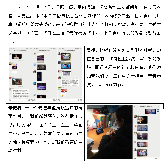 《榜樣5》集中展示了疫情防控工作中涌現出的先進基層黨組織和優秀共產黨員的風采,是學習宣傳偉大抗疫精神,開展黨員教育的生動教材。專題節目中的先進典型,充分展現了共產黨員的價值追求,生動詮釋了合格黨員的具體標準,是最有形的正能量,最鮮明的宗旨觀,最直接、最直觀的言行楷模,讓師生感受到了無限的榜樣力量。