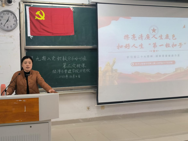 切實(shí)加強(qiáng)入黨積極分子的培養(yǎng)教育,進(jìn)一步提高黨員素質(zhì)2023124日中午,經(jīng)濟(jì)與管理學(xué)院分黨校第九期入黨積極分子培訓(xùn)班第課于一期4棟107教室如期舉行。本次黨課由經(jīng)濟(jì)與管理學(xué)院黨委副書記夏丹青主講,我院全體第九期入黨積極分子參加了此次課程。