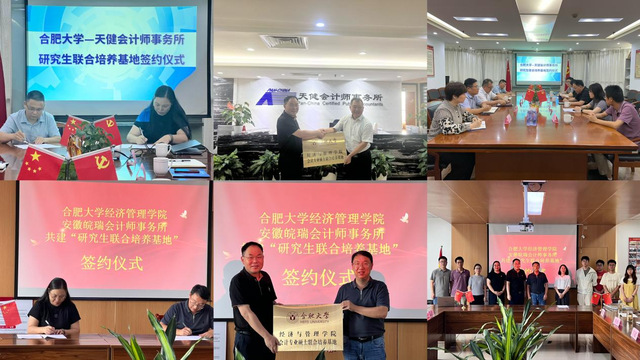 7月18日下午,合肥大學經(jīng)濟與管理學院與天健會計師事務(wù)所安徽分所、安徽皖瑞會計師事務(wù)所研究生聯(lián)合培養(yǎng)基地簽約授牌儀式分別在天健會計師事務(wù)所安徽分所、安徽皖瑞會計師事務(wù)所會議室舉行。經(jīng)濟與管理學院院長陳江華、副院長吳悅帶隊參加,天健會計師事務(wù)所安徽分所負責人喬如林、黨支部書記張揚,皖瑞會計師事務(wù)所所長丁遂、黨支部書記黃秀芳等相關(guān)負責人參會。