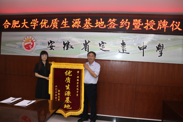 座談會上,于娜從合肥大學辦學特色、學院專業、升學就業等方面對學院進行介紹。定遠中學黨委書記戴茂俊介紹了近幾年學校取得的突出成績。會后,雙方簽署了《合肥大學優質生源基地共建協議書》,并共同為“合肥大學優質生源基地”揭牌。