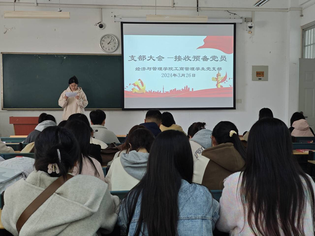 為響應黨中央號召,踐行黨的組織路線,深入推進黨員隊伍建設,2024年3月26日,經濟與管理學院工商管理學生黨支部在博學樓C座101室召開接收預備黨員支部大會,迎接方霞、許可兩位同志加入支部大家庭。