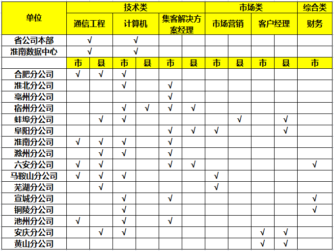 應聘條件: 1.年齡 不超過30周歲(1991年3月31日及以后出生) 2.專業 通信工程、計算機、集客解決方案經理、客戶經理類職位要求通信、計算機、電子、互聯網、物聯網、電氣工程與自動化、軟件工程等相關專業。 市場營銷類職位要求數理統計、應用數學、通信、計算機、市場營銷等相關專業。 財務類職位要求財務、會計、稅務、審計等相關專業。 3.其他 身心健康,體檢合格,技術類崗位無色盲色弱。 具體條件請見招聘網站。 四、報名方法及時間 報名方法:登陸安徽移動招聘官方網站進行報名。相關招聘動態敬請關注安徽移動招聘官方微信公眾號(微信關注安徽移動招聘)。 報名時間:即日起至2021年3月31日。 五、招聘程序 網上報名--簡歷篩選--筆試(暫定4月10日)--面試(4月下旬)--簽訂就業協議--體檢--入職 六、注意事項 1.最多可申報2個單位,同一單位最多可申報2個職位。 2.應聘者向本公司提供的個人資料,必須是真實、有效和準確的。一旦發現應聘者提供虛假資料,我們保留在不通知的情況下取消申請資格的權利。 3.應聘者若取得的是國(境)外學歷,需滿足以下條件:經國家教育部留學服務中心認證的國(境)外大學本科及以上學歷學位。其中中外合作辦學性質的須同時獲得辦學雙方頒發的學歷學位,且其國內學歷學位須符合普通高等教育形式全日制國民教育系列的要求。 4.應聘人員須保持手機和郵箱的暢通,我們會通過短信、電話或郵件的方式將筆試、面試及錄用等信息通知到應聘者本人。(注:對于在各招聘流程中落選人員,有可能無法通知到本人,敬請諒解) 5.聯系我們: amcchr@139.com