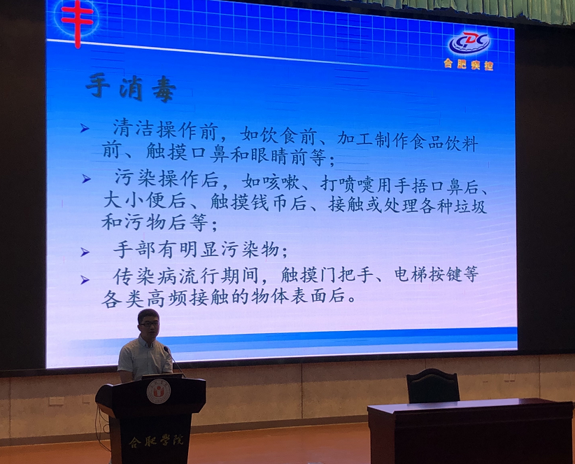 9月24日上午,我校邀請合肥市疾病預(yù)防控制中心經(jīng)開分站張歡站長在圖書館報(bào)告廳A廳開展疫情防控之校園消毒知識培訓(xùn),為開學(xué)后疫情防控常態(tài)化工作提供助力。物業(yè)、食堂管理人員和員工代表共計(jì)40余人參加了培訓(xùn)。